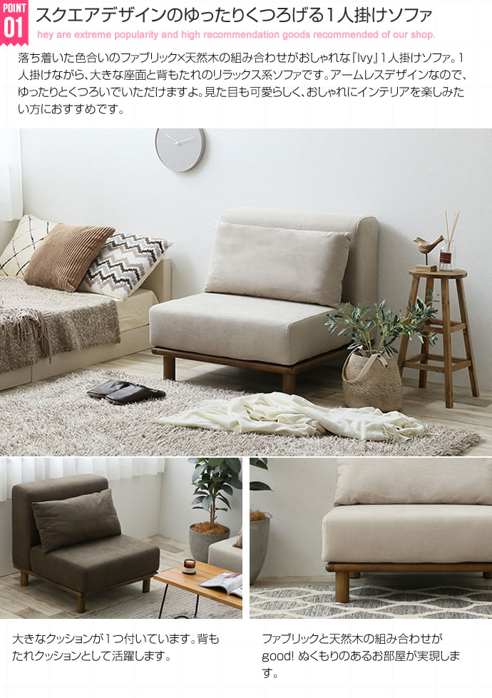1人掛けローソファ 1人掛ソファー コンパクト ファブリック 天然木 おしゃれ 北欧 モダン クッション付き アームレス 肘なし Ivy 脚付きソファ 1人がけソファ 一人がけソファー シンプル ひとり暮らし ワンルーム