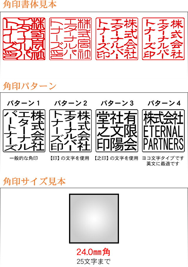 ■会社実印 18.0×60mm〜21.0×60mm ■会社銀行印 16.5×60mm〜18.0×60mm ■会社認印 15.0×60mm〜18.0×60mm ■会社角印 15.0×60mm〜24.0×60mm 最大彫刻文字数 ■丸印 ・18.0mm丸 内枠 → 8文字 外枠 → 16文字 ■角印 24.0mm → 25文字 ※最大文字数は書体や文字によって変わる場合がございます。